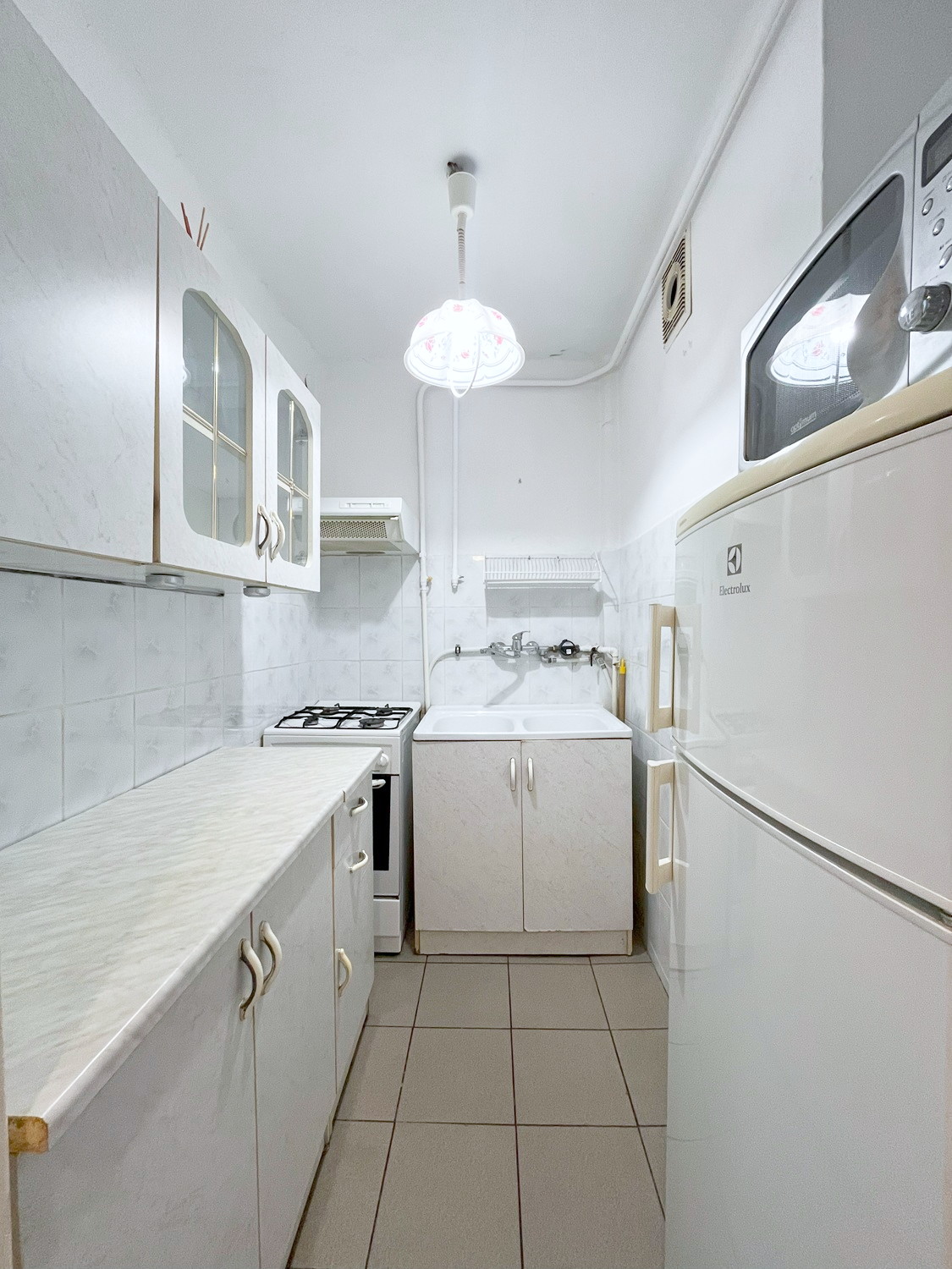 – meble kuchenne ze sprzętem AGD (płyta gazowa, piekarnik elektryczny, lodówka, okap), zlew,