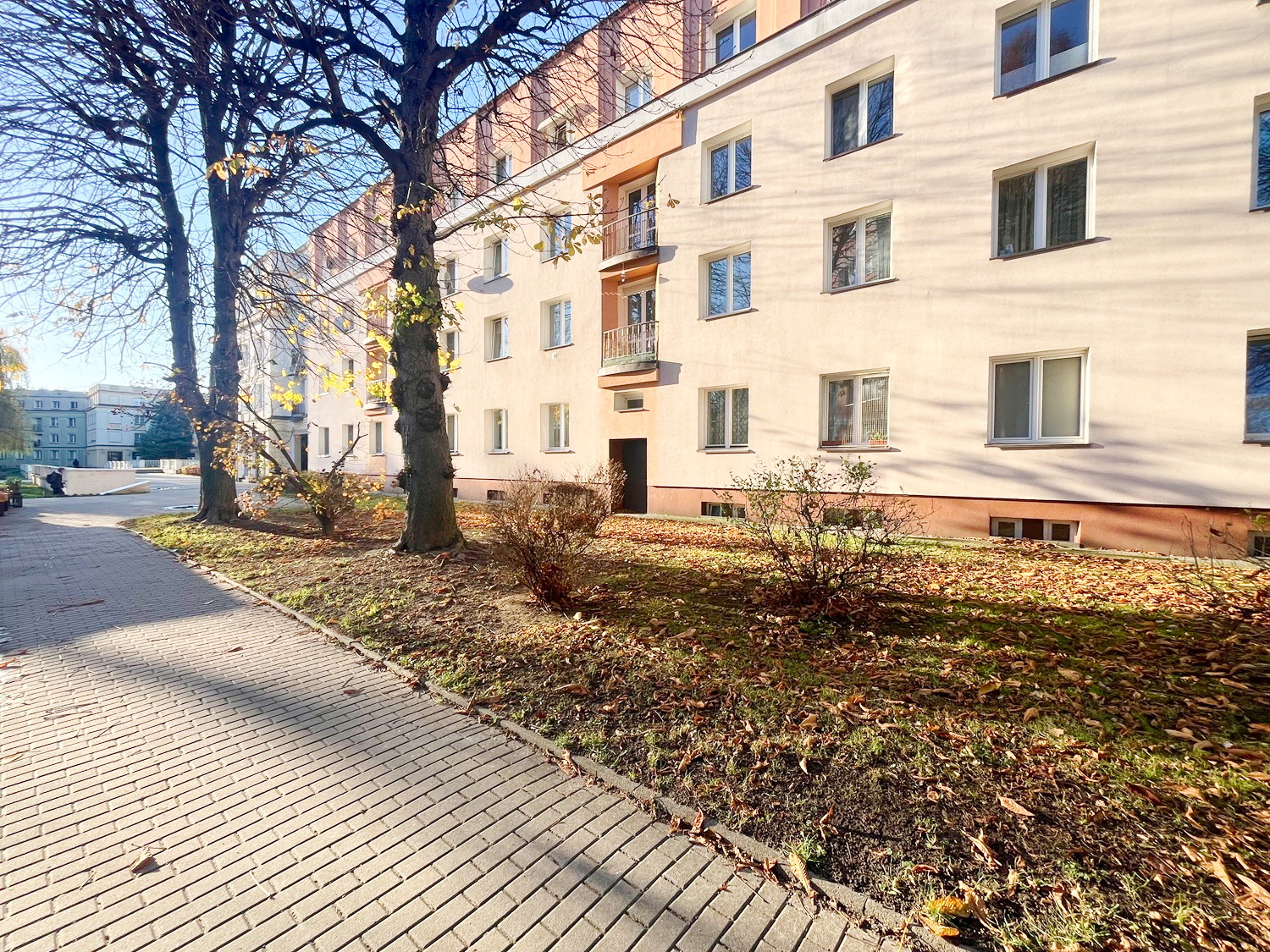 Mieszkanie ma powierzchnię 36,76 m2 i mieści się na 2 piętrze niskiego bloku z cegły.