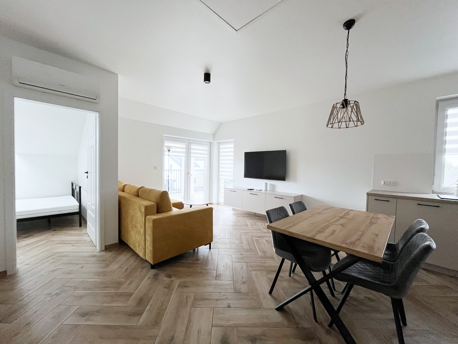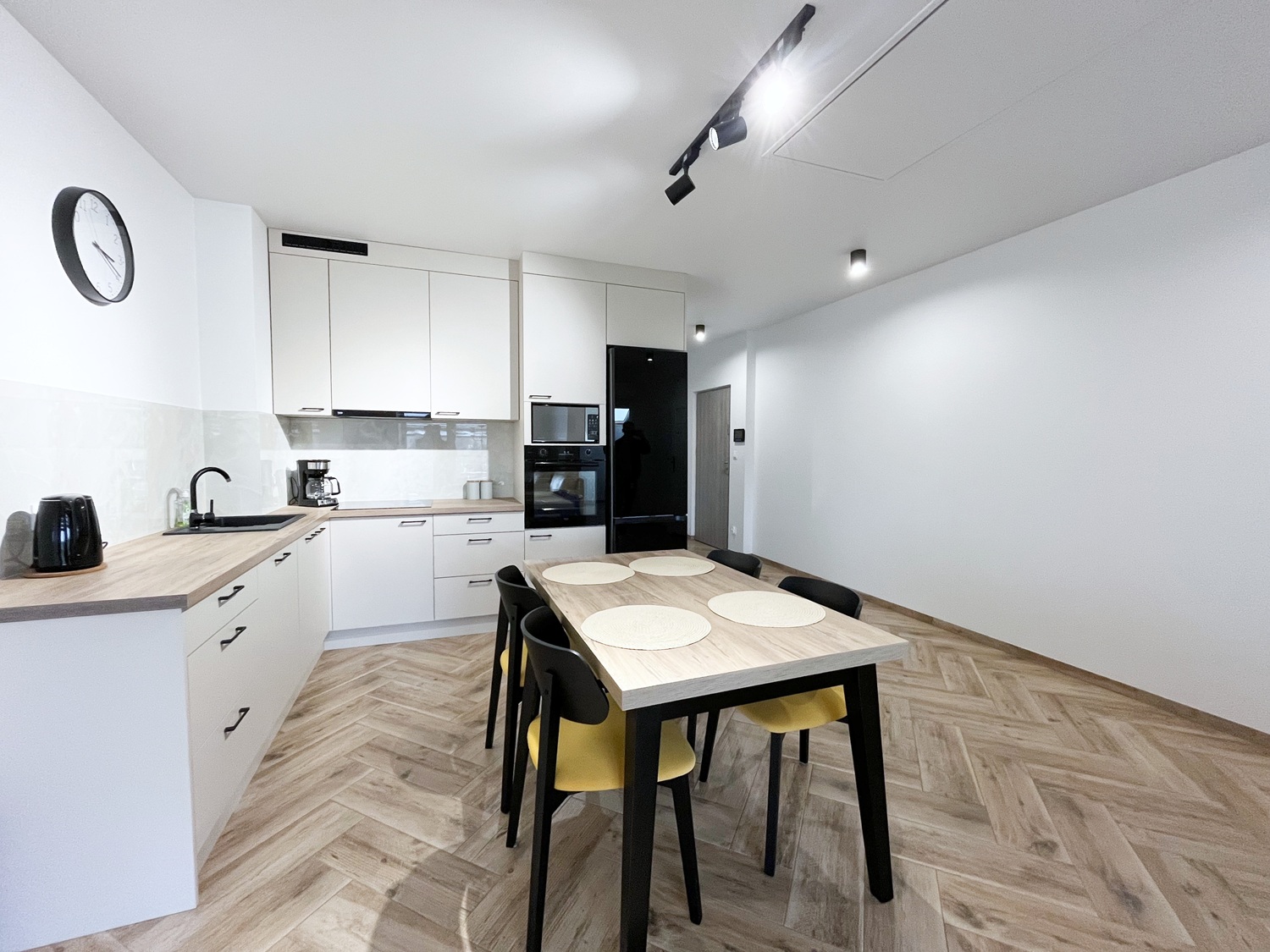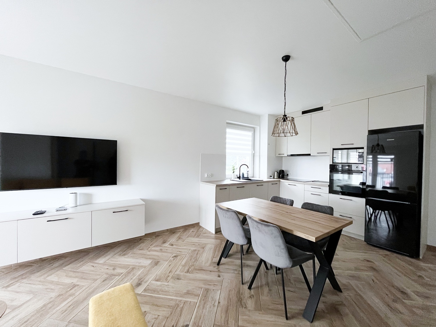 – aneks kuchenny z sprzętem AGD (lodówka, płyta indukcyjna, okap, lodówka, piekarnik, zmywarka, mikofalówka), stół + 4 krzesła,