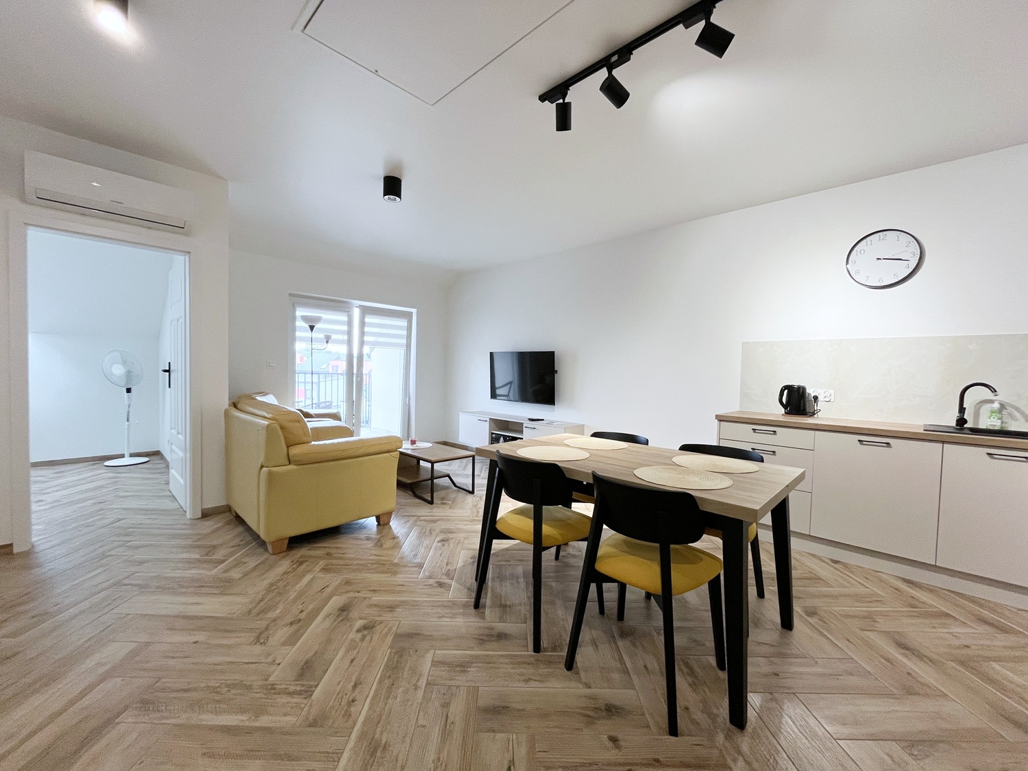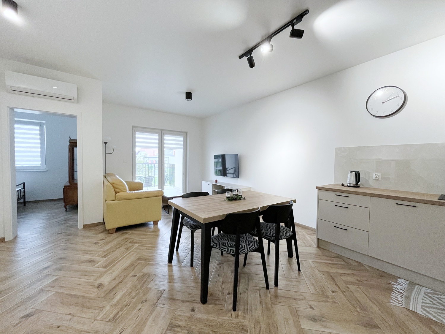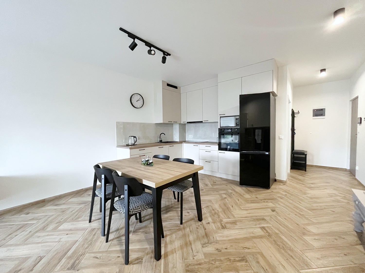 – aneks kuchenny z sprzętem AGD (lodówka, płyta indukcyjna, okap, lodówka, piekarnik, zmywarka, mikofalówka), stół + 4 krzesła,