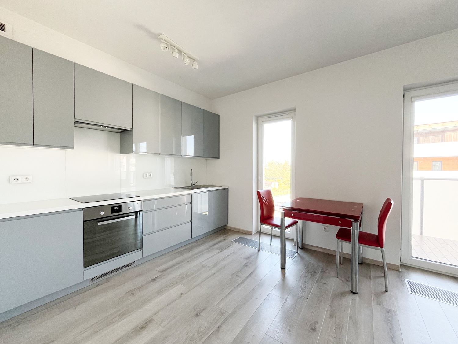 – meble kuchenne ze sprzętem AGD (płyta indukcyjna, piekarnik, lodówka, okap), zlew, stół, 2 krzesła,
