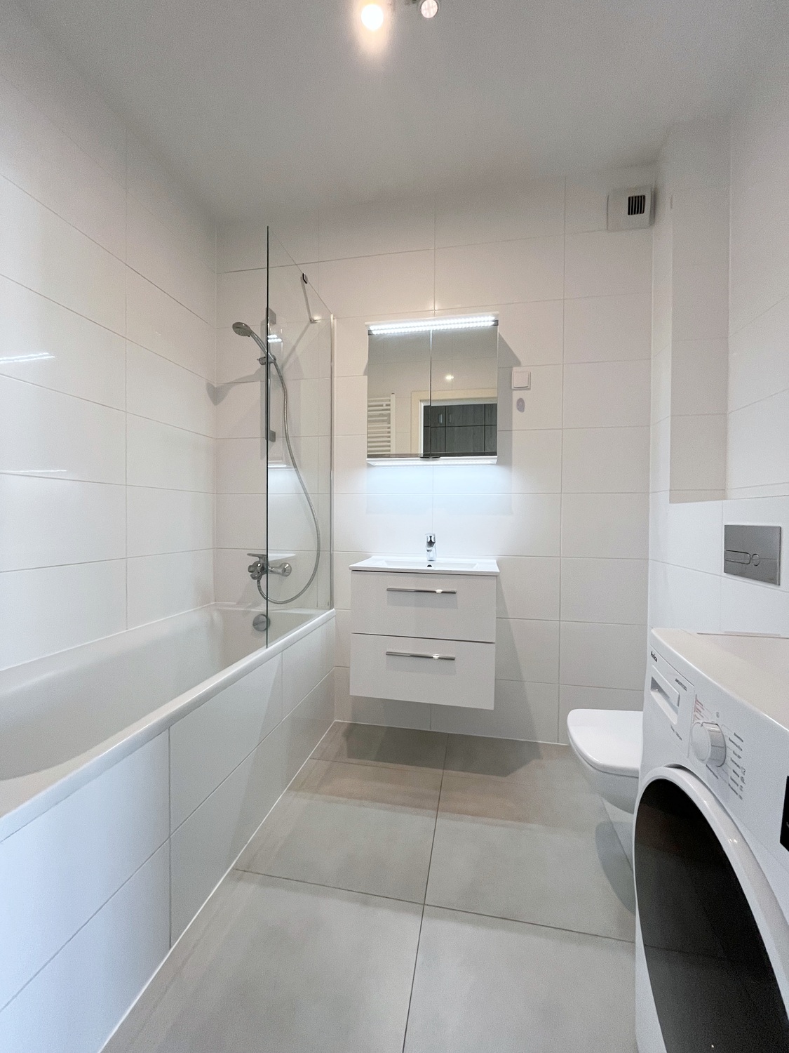 – w łazience: wanna, umywalka z szafką, lustro z szafką, kompakt wc, pralka.