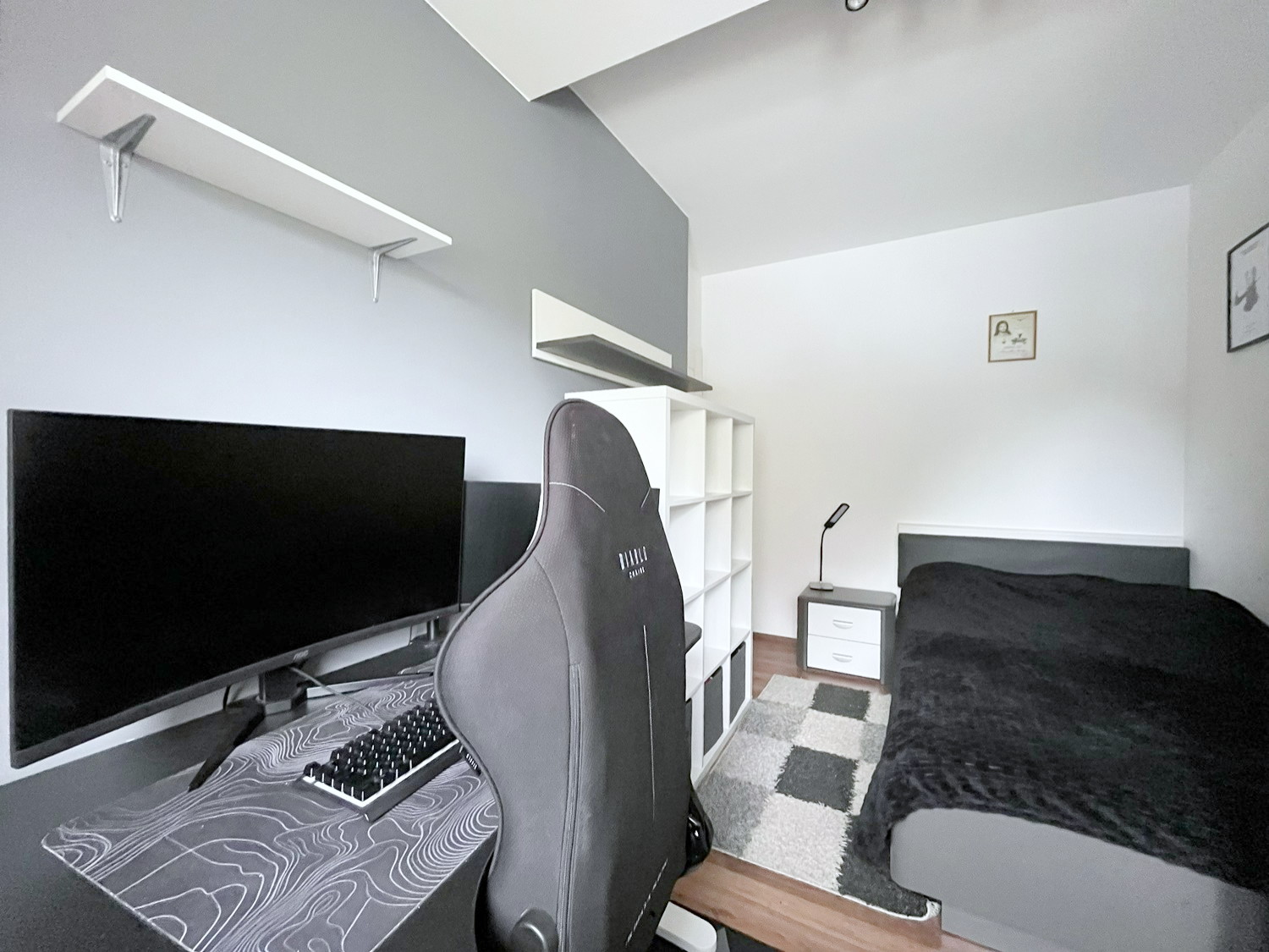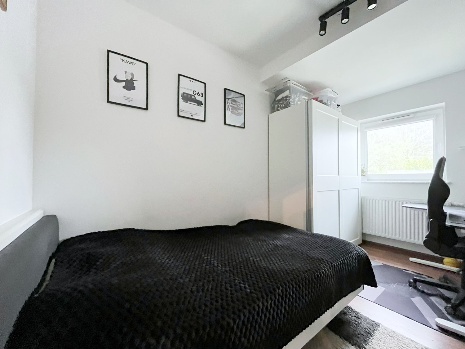 – w sypialniach: szafa w zabudowie, łóżko pojedyncze, szafa, regał, biurko, 2 półki,
