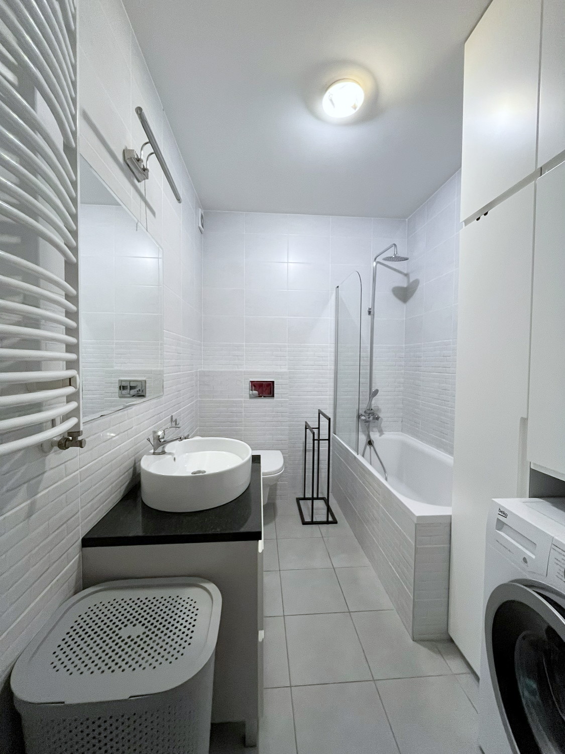 – w łazience: wanna z szyba, lustro, umywalka z szafką i granitowym blatem, pralka, kompakt wc, zabudowa szafkowa, piec gazowy,