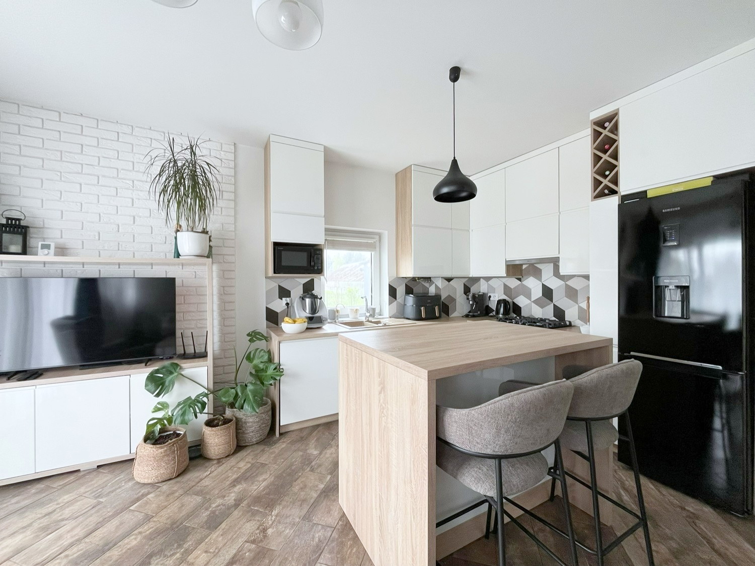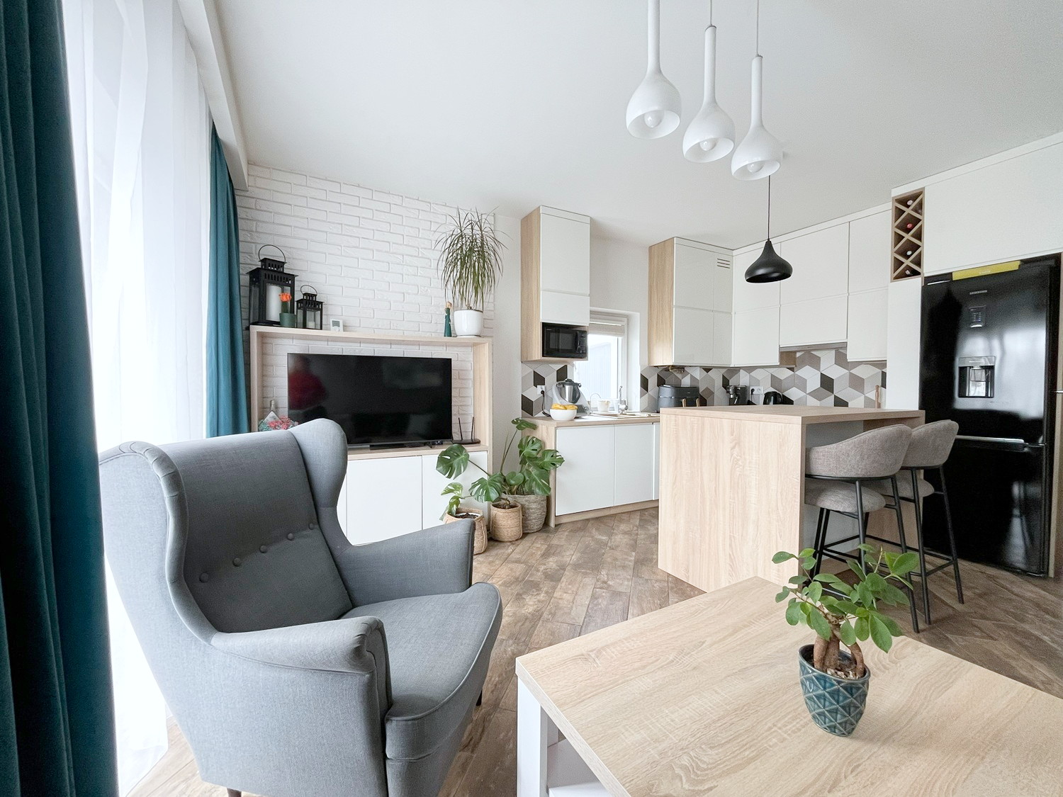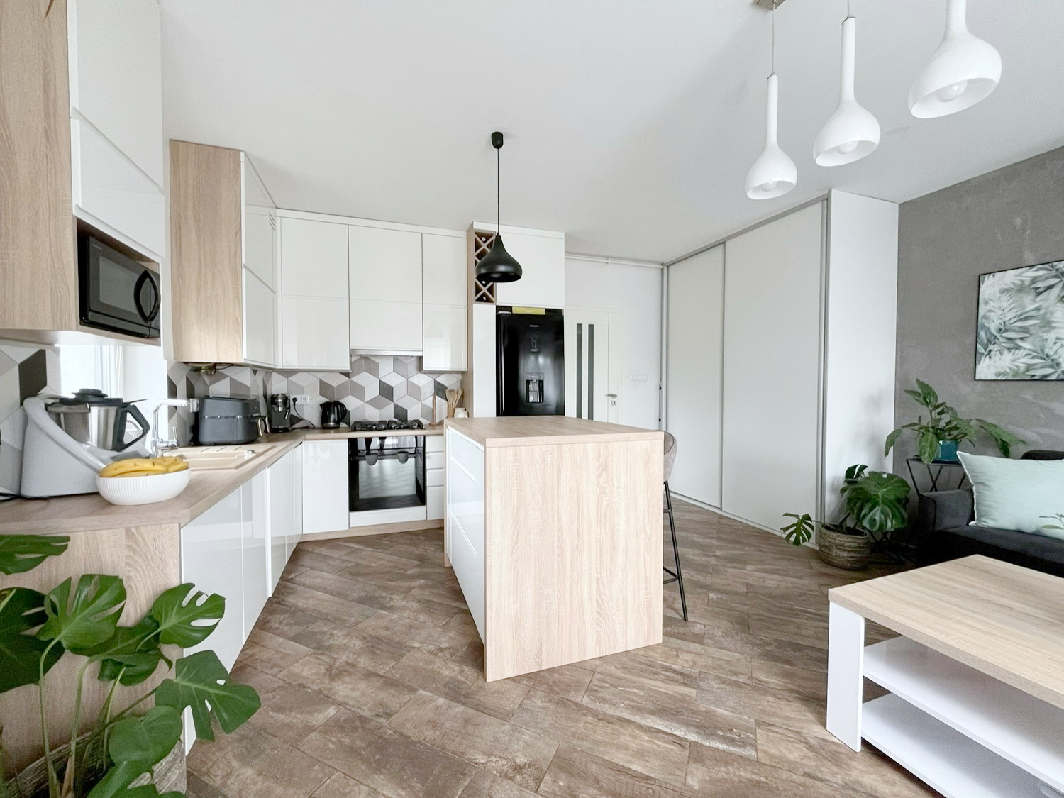 – meble kuchenne z sprzętem AGD (lodówka, piekarnik, płyta indukcyjna, zmywarka, mikrofalówka, okap),