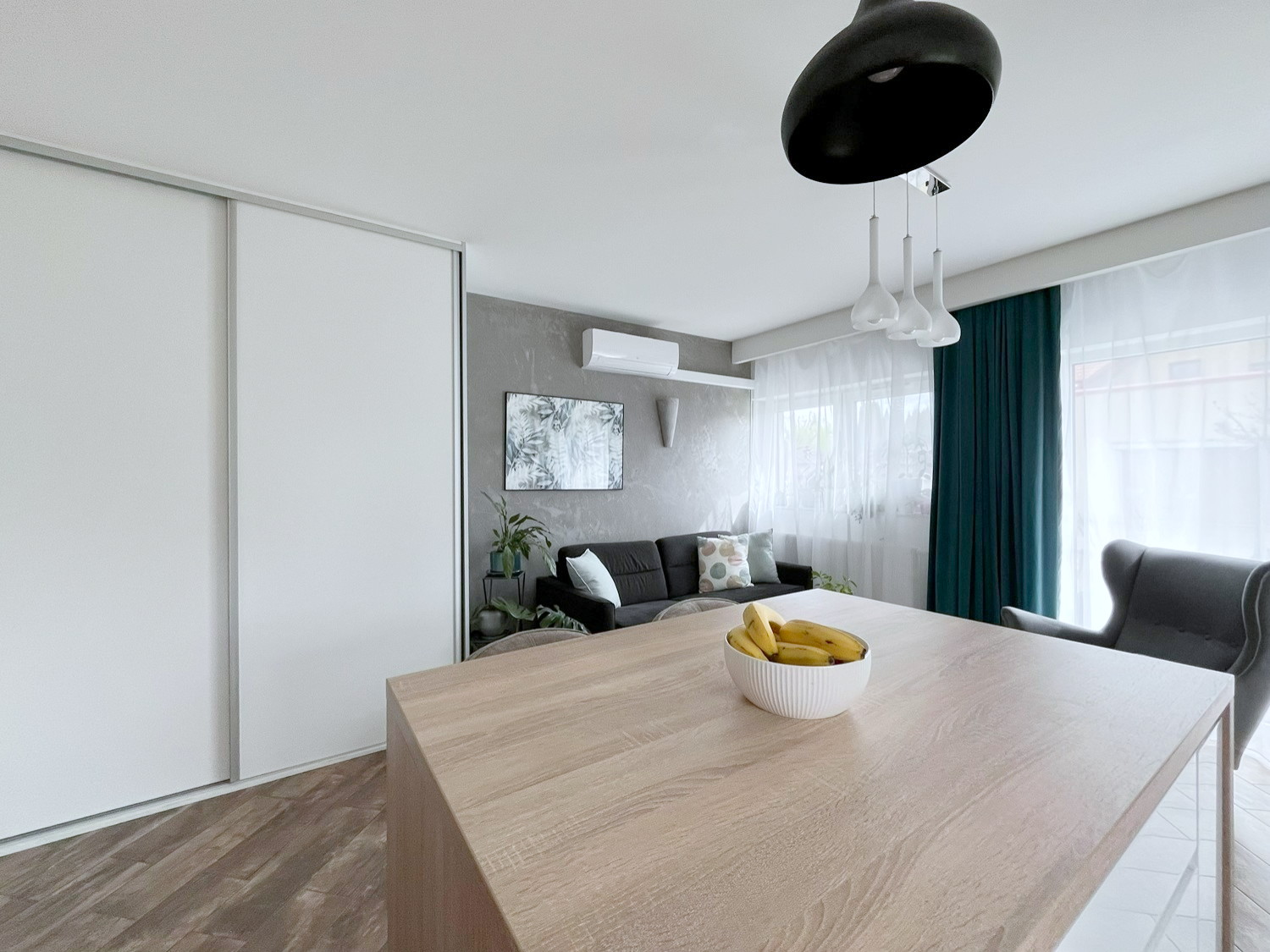 – w salonie: szafa w zabudowie, komoda rtv, klimatyzacja,