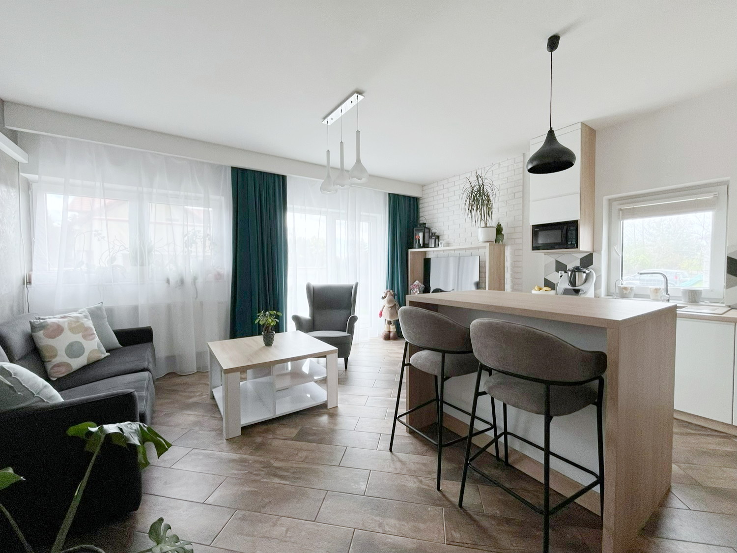 – salon + otwarta kuchnia z oknem z wyjściem na ogród,